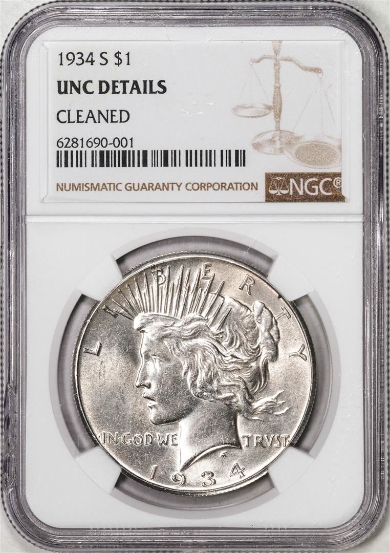 One 1934-S $1 Peace Silver Dollar Coin NGC Uncirculated Details, please note there is a small chip to the holder as shown in the pictures included with this lot. NGC Certified.