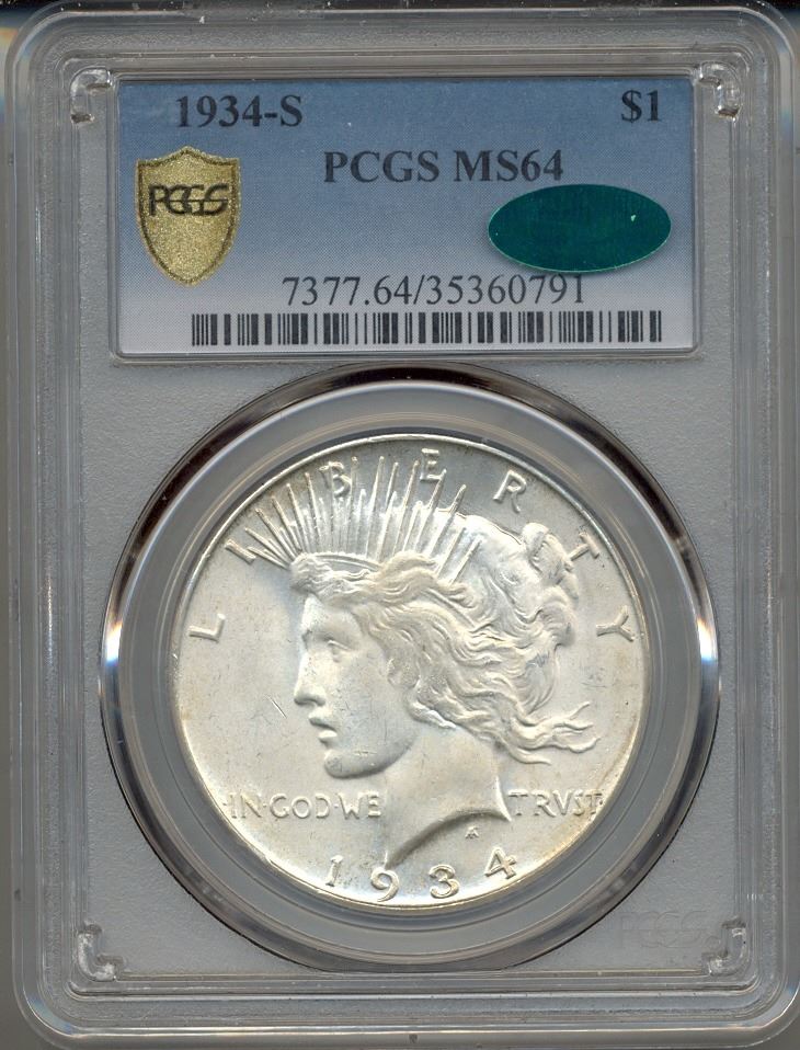 One 1934-S $1 Peace Silver Dollar Coin PCGS MS64 CAC.