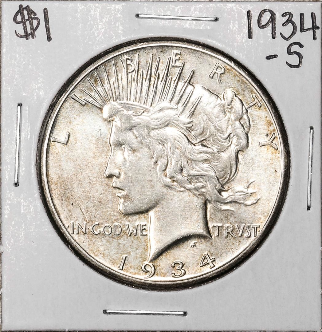 One 1934-S $1 Peace Silver Dollar Coin.