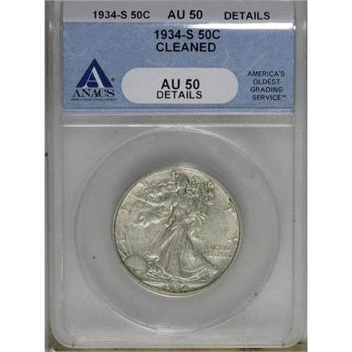 <B>1934-S 50C --Cleaned--ANACS. AU50 Details.</B></I> NGC Census: (10/598). PCGS Population (12/1089). Mintage: 3,652,000. Numismedia Wsl. Price for NGC/PCGS coin in AU50: $75. (#6594)<BR><BR><B>Coin Engraver:</B> Adolph A. Weinman<BR><BR><b>Shipping:</b> Coins & Currency (<a target="_blank" href="http://www.heritageauctions.com/common/shipping.php">view shipping information</a>)