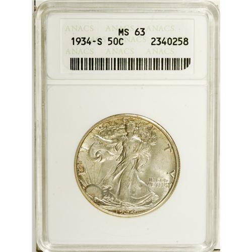 <B>1934-S 50C MS63 ANACS.</B></I> Quite lustrous with a nice strike, including partial definition on Liberty's left thumb. A few light contact marks do not detract, and wisps of golden-brown toning appear at the periphery.<BR><BR><b>Shipping:</b> Coin/Currency (<a target="_blank" href="http://www.heritageauctions.com/common/shipping.php">view shipping information</a>)