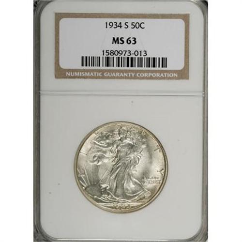 <B>1934-S 50C MS63 NGC.</B></I> The design elements of this lustrous specimen benefited from an excellent strike (unusual for this issue), as evidenced from the detail on Liberty's thumb and adjacent branches and the eagle's plumage. Freckles of light gray visit the obverse, while speckles of reddish-gold gravitate to the reverse border. Both sides possess great luster.<BR><BR><B>Coin Engraver:</B> Adolph A. Weinman<BR><BR><b>Shipping:</b> Coins & Currency (<a target="_blank" href="http://www.heritageauctions.com/common/shipping.php">view shipping information</a>)