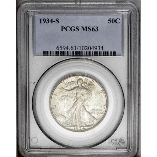 <B>1934-S<50C> MS63 PCGS.</B></I> Gray-brown, with gleaming luster under the thin veil of color. Significant surface marks are minimal on this Select piece; only light, wispy marks in the right obverse field can be considered grade-limiting. <BR><BR><B>Important notice:</B> Heritage usually auctions material at the rate of 200-250 lots per hour. On some occasions eBay Live bid software or the Internet may not be able to keep up with the pace of the auction. We recommend placing a realistic absentee bid now as insurance to avoid disappointment. Occasionally the auctioneer may eliminate or reject an eBay Live bid, and the auctioneer may also reopen a lot after the close of the eBay live bidding (usually because we missed an audience bid), and may reject your bid even if it shows you as the winning bidder. By bidding via eBay Live, you agree that Heritage may award the lot to another bidder at its sole discretion under the circumstances described above or any other reasonable circumstances. Since eBay bids are not shown to us until we open the lot on the floor, we treat those bids just like floor bids. In most cases the floor responds before the eBay bid is presented to us, due to Internet lag time, so for consistency we have made it a policy that floor bids are always considered first over tie eBay live bids. Also please note that all Heritage lots purchased through eBay Live carry a 20% Buyer's Premium. Please make sure you read the Terms and Conditions before you bid. This lot is being auctioned in conjunction with a live floor auction by Heritage Galleries & Auctioneers. All final auction and invoice information will be supplied by Heritage Galleries & Auctioneers, and all other information should be considered preliminary. Lot:2944 <BR><BR><B>Winning Notification and Billing:</B> After the FINAL session in this auction is complete, Heritage will send e-mail and snail mail invoices. This process normally takes several days. All final auction and invoice information will be supplied by Heritage Galleries & Auctioneers, and all other information should be considered preliminary. <BR><BR>This auction will be conducted on a live auction floor and over the Internet through eBay Live. If you choose to place an absentee bid, please take a moment to <font color='#0000ff'><u><a href='http://pages.ebay.com/liveauctions/help/before/laabsentee.html'>learn how eBay Live absentee bidding works</a></u></font><font color='#000000'>