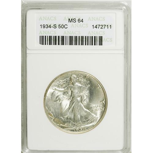 <B>1934-S 50C MS64 ANACS.</B></I> Choice with pleasing luster and surprising definition on the branch hand. Whispers of blue and gold toning grace each side of this pretty piece.<BR><BR><b>Shipping:</b> Coins & Currency (<a target="_blank" href="http://www.heritageauctions.com/common/shipping.php">view shipping information</a>)