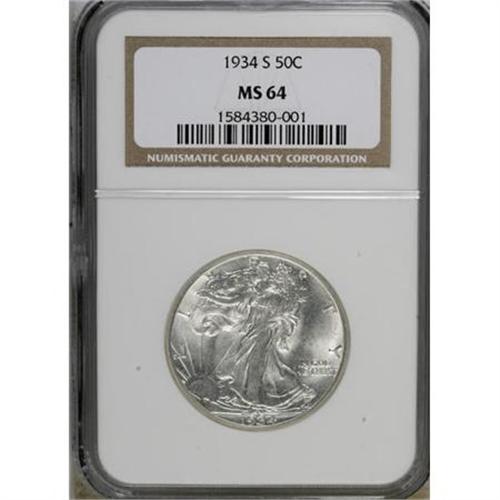 <B>1934-S 50C MS64 NGC.</B></I> Surprisingly well-defined for the issue with excellent central detail. The satiny, minimally toned surfaces are pleasingly preserved, though a handful of light marks preclude Gem status.<BR><BR><B>Coin Engraver:</B> Adolph A. Weinman<BR><BR><b>Shipping:</b> Coins & Currency (<a target="_blank" href="http://www.heritageauctions.com/common/shipping.php">view shipping information</a>)