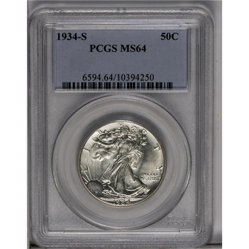 <B>1934-S<50C> MS64 PCGS.</B></I> The sharp strike is manifested by virtually full definition in Liberty's thumb and adjacent branches. Highly lustrous surfaces are essentially untoned, save for some occasional milky color, and minimally abraded.