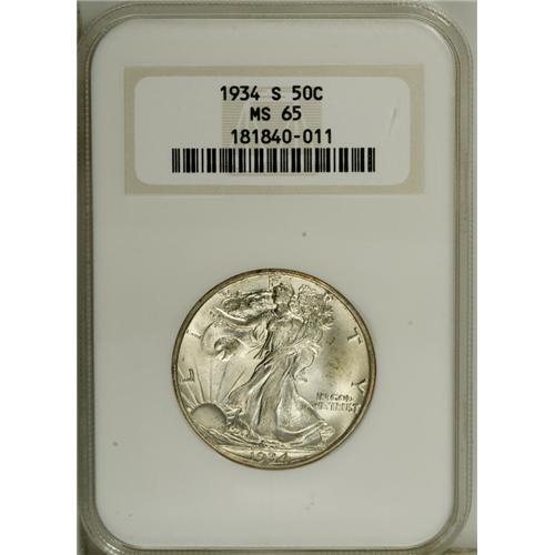 <B>1934-S 50C MS65 NGC.</B></I> This flashy San Francisco Walker has dashes of gold toning on the obverse, while the reverse displays russet freckles near the rim. The strike is above average, with only a hint of incompleteness on the cheek. The reverse is exceptionally clean, while the obverse shows trivial grazes. Housed in a prior generation NGC holder.<BR><BR><b>Shipping:</b> Coin/Currency (<a target="_blank" href="http://www.heritageauctions.com/common/shipping.php">view shipping information</a>)