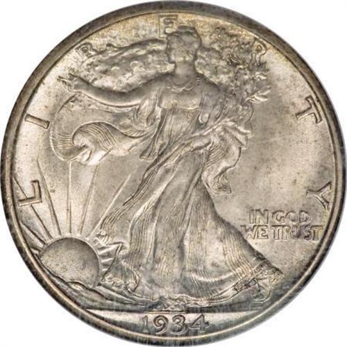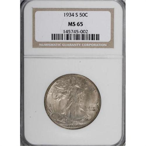 <B>1934-S 50C MS65 NGC.</B></I> Both sides of this Gem have pale heather and champagne toning over frosty luster. Splashes of iridescence add to the overall eye appeal and desirability. All of the designs are boldly defined, and nearly full. Liberty's head is slightly weak, but still shows good detail. Census: 96 in 65, 28 finer (8/07).<BR><BR><B>Coin Engraver:</B> Adolph A. Weinman<BR><BR><b>Shipping:</b> Coins & Currency (<a target="_blank" href="http://www.heritageauctions.com/common/shipping.php">view shipping information</a>)