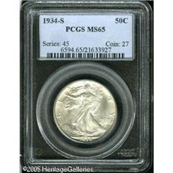 <B>1934-S 50C MS65 PCGS.</B></I> A sharp strike and flashy mint luster are the two characteristics that are shared by most upper level 1934-S Half Dollars. This coin certainly has both attributes and there is just a bit of slight toning on each side and a couple of tiny field marks. Lot:8027