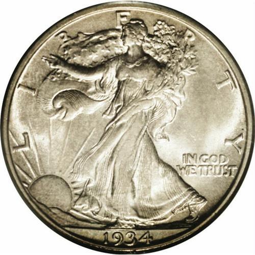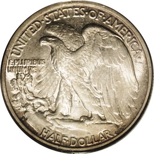 <B>1934-S<50C> MS65 PCGS.</B></I> Blended chestnut and dove-gray colors endow this lustrous and beautifully preserved Gem. The San Francisco Mint has a reputation for soft strikes on Walking Liberty Halves, however, no one could come to such a conclusion based upon the present intricately defined example. A lintmark beneath the IT in UNITED is strictly of mint origin. Certified in an older green-label PCGS holder.