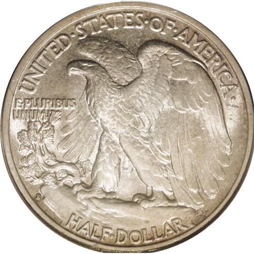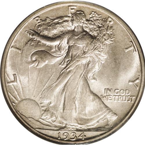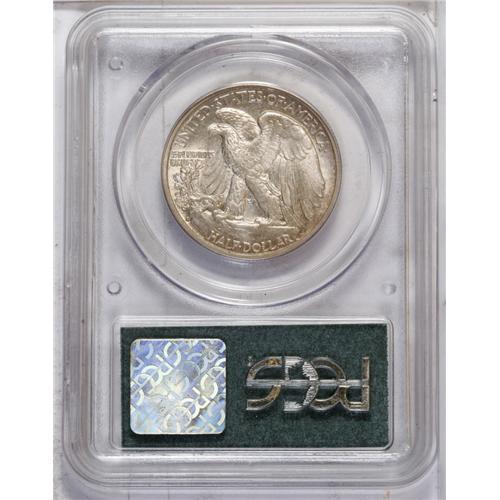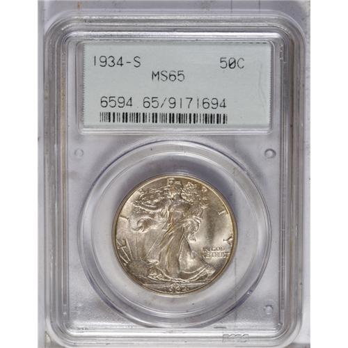 <B>1934-S<50C> MS65 PCGS.</B></I> Blended chestnut and dove-gray hues grace this lustrous and beautifully preserved Gem. The San Francisco Mint has a reputation for soft strikes on Walking Liberty halves, but no one could draw such a conclusion from the present intricately defined example. A lintmark beneath the IT in UNITED is strictly of mint origin. Certified in an older green-label PCGS holder.