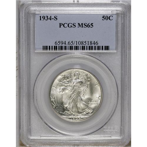 <B>1934-S 50C MS65 PCGS.</B></I> This crisply struck Gem has a beautifully preserved reverse, and the right obverse field has only minor contact. Delicate olive toning precludes full brilliance. Booming luster dominates all crevices of the design. A popular Great Depression issue.<BR><BR><b>Shipping:</b> Coin/Currency (<a target="_blank" href="http://www.heritageauctions.com/common/shipping.php">view shipping information</a>)