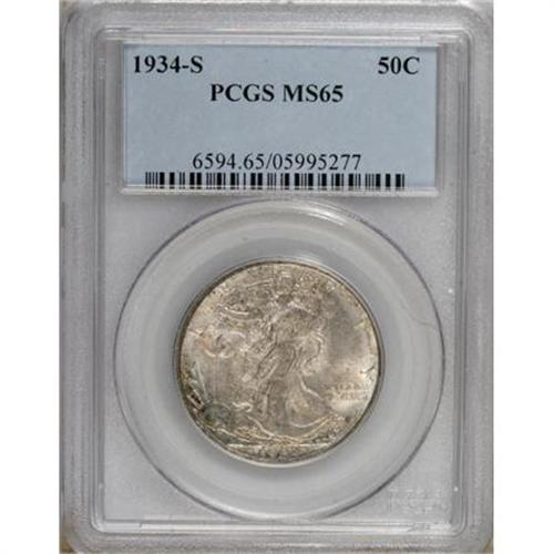 <B>1934-S 50C MS65 PCGS.</B></I> A light coating of original, speckled patina covers both sides of this satiny Gem. Well struck and lustrous, the piece displays a couple of minor marks in the right obverse field, while the reverse seems blemish-free. The scarcest of the later dates in the Walking Liberty series, and in considerable demand by collectors of the "short set." <BR><BR><b>Shipping:</b> Coins & Currency (<a target="_blank" href="http://www.heritageauctions.com/common/shipping.php">view shipping information</a>)
