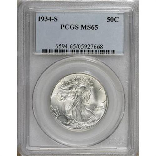 <B>1934-S 50C MS65 PCGS.</B></I> A brilliant example of this popular Depression-era issue. The strike is good for an S-mint Walker, despite some softness on Liberty's cheek and her branch hand. Thorough evaluation locates a shiny graze concealed within the wing, but the sun is pristine.<BR><BR><b>Shipping:</b> Coins & Currency (<a target="_blank" href="http://www.heritageauctions.com/common/shipping.php">view shipping information</a>)