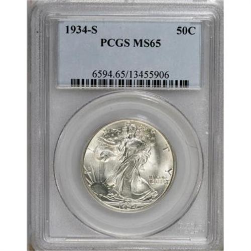 <B>1934-S 50C MS65 PCGS.</B></I> This essentially brilliant Gem features an impressive strike for an S-mint Walker. Better yet, even thorough examination locates only trivial imperfections. Scintillating luster confirms the originality. An exemplary example of this Great Depression issue.<BR><BR><B>Coin Engraver:</B> Adolph A. Weinman<BR><BR><b>Shipping:</b> Coins & Currency (<a target="_blank" href="http://www.heritageauctions.com/common/shipping.php">view shipping information</a>)