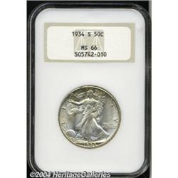 <B>1934-S<50C> MS66 NGC.</B></I> The '34-S is the scarcest of the 1934 issues. Bruce Fox, in his <I>The Complete Guide To Walking Liberty Half Dollars,</B></I> notes that fully struck Gems are difficult to find, and that on average, strike is weaker on the reverse. The present example, while not fully struck, displays boldly impressed devices on both sides. Liberty's head detail is nicely defined, as is the left hand and thumb and adjacent oak and laurel branches. Likewise, the eagle's feathers show nice detail, including most of those on the left leg, that often show weakness on many examples. The relatively well preserved surfaces exhibit vibrant luster beneath varying shades of golden-orange color.<BR><I>From The Dr. Frank Lanza Collection of Walking Liberty Half Dollars.</B></I> <BR><BR><B>Important notice:</B> Heritage usually auctions material at the rate of 200-250 lots per hour. On some occasions eBay Live bid software or the Internet may not be able to keep up with the pace of the auction. We recommend placing a realistic absentee bid now as insurance to avoid disappointment. Occasionally the auctioneer may eliminate or reject an eBay Live bid, and the auctioneer may also reopen a lot after the close of the eBay live bidding (usually because we missed an audience bid), and may reject your bid even if it shows you as the winning bidder. By bidding via eBay Live, you agree that Heritage may award the lot to another bidder at its sole discretion under the circumstances described above or any other reasonable circumstances. Since eBay bids are not shown to us until we open the lot on the floor, we treat those bids just like floor bids. In most cases the floor responds before the eBay bid is presented to us, due to Internet lag time, so for consistency we have made it a policy that floor bids are always considered first over tie eBay live bids. Also please note that all Heritage lots purchased through eBay Live carry a 20% Buyer's Premium. Please make sure you read the Terms and Conditions before you bid. </span></font></tr></table></td></tr></table>