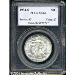 <table><tbody><tr><td><table> <TR><TD width="100%"><TABLE cellSpacing=1 cellPadding=3 width="100%" border=0><TBODY><TR><TD width="100%" bgColor=#79735c><FONT face=arial color=#ffffff size=3><B>Description</B> </FONT></TD></TR><TR><TD width="100%" bgColor=#ffffff><FONT face=arial size=2><B>1934-S 50C MS66 PCGS.</B></I> The 1934-S has been shown through population figures to be the scarcest issue in the so-called second half of the Walking Liberty series, which includes coins from 1934 through 1947. Even an MS65 example is unusual and the number of MS66 or better '34-S Walkers we have offered over the past five years can be counted on one's fingers. This shimmering silver-gray representative displays soft, frosted luster and typically bold central details. Surface marks are both few in number and unobtrusive, most being strategically placed on the reverse. </FONT></TD></TR></TBODY></TABLE></TD></TR></TBODY></TABLE><BR><A name=PricesRealized></A><TABLE cellSpacing=0 cellPadding=0 width="100%" bgColor=#000000 border=0><TBODY><TR><TD width="100%"><TABLE cellSpacing=1 cellPadding=3 width="100%" border=0><TBODY><TR><TD width="100%" bgColor=#79735c><A name=PR><FONT face=arial color=#ffffff size=3><B>Previous Prices from Heritage Auctions</B> </FONT></A></TD></TR><TR><TD bgColor=#f6f6ed><TABLE cellSpacing=0 cellPadding=0 width="100%" border=1><TBODY><TR><TD align=middle width="33%"><B>Date</B></TD><TD align=middle width="33%"><B>Service</B></TD><TD align=middle width="33%"><B>Price</B></TD></TR><TR bgColor=whitesmoke><TD width="33%"><B>07/29/2003</B></TD><TD width="33%">PCGS</TD><TD width="33%">$4,140.00</TD></TR><TR bgColor=whitesmoke><TD width="33%"><B>06/08/2002</B></TD><TD width="33%">PCGS</TD><TD width="33%">$4,025.00</TD></TR><TR bgColor=whitesmoke><TD width="33%"><B>01/08/1999</B></TD><TD width="33%">PCGS</TD><TD width="33%">$3,565.00</TD></TR><TR bgColor=whitesmoke><TD width="33%"><B>04/02/1993</B></TD><TD width="33%">NGC</TD><TD width="33%">$2,860.00</TD></TR><TR bgColor=whitesmoke><TD width="33%"><B>10/26/2000</B></TD><TD width="33%">NGC</TD><TD width="33%">$2,760.00</TD></TR><TR bgColor=whitesmoke><TD width="33%"><B>12/01/1997</B></TD><TD width="33%">PCGS</TD><TD width="33%">$3,410.00</TD></TR><TR bgColor=whitesmoke><TD width="33%"><B>01/01/1997</B></TD><TD width="33%">PCGS</TD><TD width="33%">$3,080.00</TD></TR></TBODY></TABLE></TD></TR><TR><TD bgColor=#ffffff><FONT face=arial size=1 ?>PLEASE NOTE: All prices realized reflect the final hammer price PLUS the buyer's premium in auctions that charge a buyer's premium. Each item has a notation at the top of the listing indicating whether that lot included a buyer's premium. Example: A item that sells with a final hammer price of $100 and a 20% buyer's premium will display with a price realized of $120. All information listed is intended to be as accurate as possible, but errors are possible. Please use this guide carefully and inform us of any inaccuracies. </FONT></TD></TR></TBODY></TABLE></TD></TR></TBODY></TABLE><BR><TABLE cellSpacing=0 cellPadding=0 width="100%" bgColor=#000000 border=0><TBODY><TR><TD width="100%"><TABLE cellSpacing=1 cellPadding=3 width="100%" border=0><TBODY><TR><TD width="100%" bgColor=#79735c colSpan=6><FONT face=arial color=#ffffff size=3><B>Price Guide*</B> </FONT></TD></TR><TR bgColor=#f6f6ed><TD align=middle><B>Grade</B> </TD><TD align=middle><B>Coin World<BR>(Trends)</B> </TD><TD align=middle><B>Numismedia<BR>Retail</B> </TD><TD align=middle><B>Numismedia<BR>Wholesale</B> </TD><TD align=middle><B>Coin<BR>Universe</B> </TD><TD align=middle><B>Heritage<BR>Value Index</B> </TD></TR><TR bgColor=#ffffff><TD align=middle>65</TD><TD align=right>$4,000.00</TD><TD align=right>---</TD><TD align=right>$2,775.00</TD><TD align=right>$5,000.00</TD><TD align=right>$3,225.00</TD></TR><TR style="FONT-WEIGHT: bold" bgColor=#cccfdd><TD align=middle>66</TD><TD align=right>$5,000.00</TD><TD align=right>---</TD><TD align=right>$3,900.00</TD><TD align=right>$6,850.00</TD><TD align=right>$4,145.00</TD></TR><TR bgColor=#ffffff><TD align=middle>67</TD><TD align=right>---</TD><TD align=right>---</TD><TD align=right>$9,225.00</TD><TD align=right>$16,500.00</TD><TD align=right>$10,150.00</TD></TR><TR bgColor=#ffffff><TD colSpan=6><FONT size=1>*All information listed is intended to be as accurate as possible, but errors are possible. No item may be returned or refused based on this information which is provided as a service to our customers. You should contact each pricing source directly to determine the accuracy of this information. </FONT></TD></TR></TBODY></TABLE></TD></TR></TBODY></TABLE><BR><TABLE cellSpacing=0 cellPadding=0 width="100%" bgColor=#000000 border=0><TBODY><TR><TD width="100%"><TABLE cellSpacing=1 cellPadding=3 width="100%" border=0><TBODY><TR><TD width="100%" bgColor=#79735c><FONT face=arial color=#ffffff size=3><B>Population Guide</B> </FONT></TD></TR><TR bgColor=#ffffff><TD align=middle><!-- Begin Output of Population Grid--><TABLE cellSpacing=0 cellPadding=0 width="100%" border=0><TBODY><TR><TD vAlign=center><TABLE cellSpacing=0 width="100%" border=1 cellsadding="3"><TBODY><TR><TD vAlign=center><TABLE cellSpacing=0 cellPadding=3 width="100%" border=1><TBODY><TR><TD vAlign=center align=middle bgColor=#f0f1e8 colSpan=2 <CENTER><FONT face=Arial size=2><B>PCGS Pop </B></FONT><CENTER></CENTER></TD><TD vAlign=center align=middle bgColor=#f0f1e8 colSpan=2><CENTER><FONT face=Arial size=2><B>NGC Pop</B></CENTER></FONT></TD></TR><TR><TD vAlign=center><FONT face=Arial size=2>(66)</FONT> </TD><TD vAlign=center align=right><FONT face=Arial size=2>67</FONT> </TD><TD vAlign=center><FONT face=Arial size=2>(66)</FONT> </TD><TD vAlign=center align=right><FONT face=Arial size=2>23</FONT> </TD></TR><TR><TD vAlign=center><FONT face=Arial size=2>(>66)</FONT> </TD><TD vAlign=center align=right><FONT face=Arial size=2>3</FONT> </TD><TD vAlign=center><FONT face=Arial size=2>(>66)</FONT> </TD><TD vAlign=center align=right><FONT face=Arial si