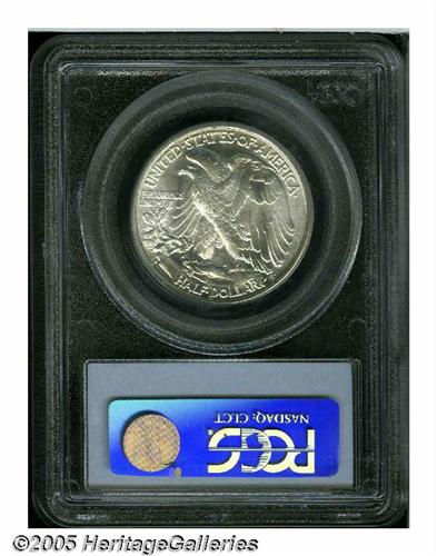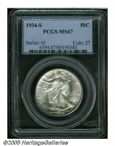 <B>1934-S<50C> MS67 PCGS.</B></I> Nearly every San Francisco Mint Walker is characterized by weak strikes, with the exception of 1933-S and 1934-S. For some reason, these two dates come very nice, and yet, even these typically are not found as nice as this one. There has never been a finer '34-S certified. This Superb Gem is sharply struck or perhaps fully struck including a completely rounded thumb, full skirt details, and strong head details. The unblemished surfaces are fully brilliant with satiny silver luster. For the advanced specialist and connoisseur, this is a coin that will always be appreciated and enjoyed. Population: 5 in 67, 0 finer (6/05).<BR><I>From The Robert Moreno Collection.</B></I>