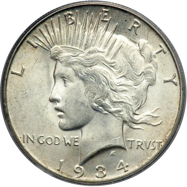 1934-S Peace Dollar. PCGS graded MS-62. A hint of light tone. Very choice for the grade, the 1934-S is scarce even though it isn't in the top five of lowest-mintage issues. Mint quality examples are actively sought by collectors (PCGS # 7377) .