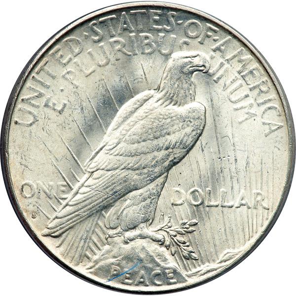 1934-S Peace Dollar. PCGS graded MS-62. A pleasing white coin with minor softening in the design at the central hair and top part of the eagle's wing. Designed by Anthony de Francisci, the Peace Dollar was so named because the word PEACE appears on the bottom of the coin's reverse. It contains 0.77344 troy ounces of silver, and was the successor to the Morgan Dollar, which had not been regularly minted since 1904. With the passage of the Pittman Act in 1918, the mintage of dollar coins was enabled to start again. Prior to the design and acceptance of the Peace Dollar, the Morgan Dollar was minted again in 1921.