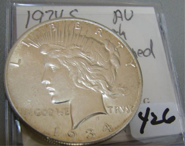 1934-S Peace Silver Dollar AU Improperly Cleaned