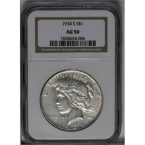 <B>1934-S<img border='0' src='http://www.heritagecoins.com/images/star.gif' width=10 height=10>$1> AU50 NGC.</B></I> A lightly worn example with soft olive-gray patina over the typically struck surfaces. Thin, shallow abrasions appear in the left obverse field.