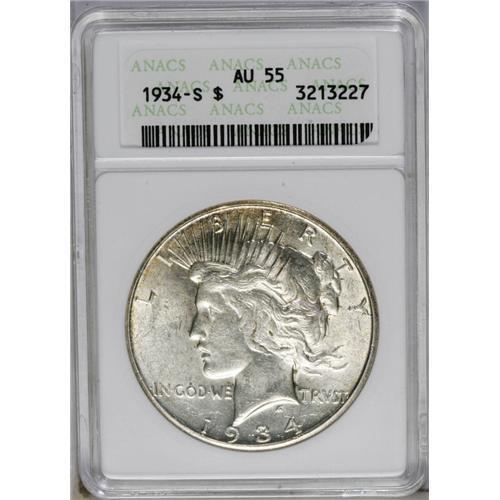 <B>1934-S<img border='0' src='http://www.heritagecoins.com/images/star.gif' width=10 height=10>$1> AU55 ANACS.</B></I> Satiny with russet toning centered at 11 o'clock on the obverse and curious blue toning that surrounds thin strike-throughs of grease on the reverse. The typical soft strike obscures where the wear stops and the weak strike begins. An attractive and affordable example of this key date.