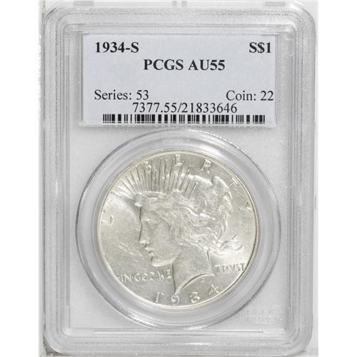 1934-S S$1 AU55 PCGS. Satiny and untoned, with numerou