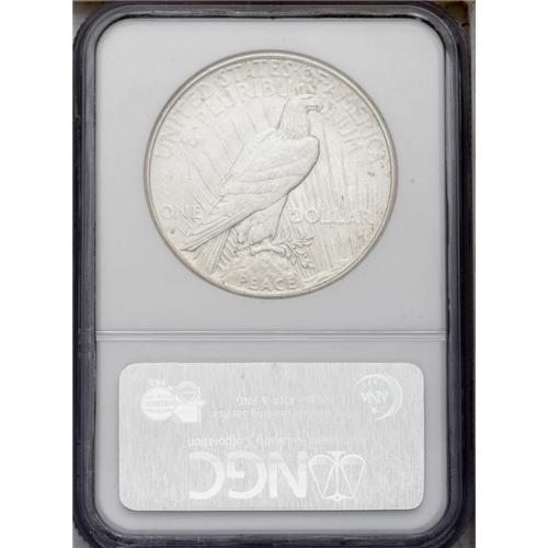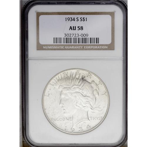 <B>1934-S<img border='0' src='http://www.heritagecoins.com/images/star.gif' width=10 height=10>$1> AU58 NGC.</B></I> Lustrous and untoned with a few wispy hairlines noticeable on the obverse. Ever so close to Mint State, with only the slightest amount of friction on the highpoints. A bit of charcoal-brown verdigris is located just above the top of Liberty's head. An affordable near-Mint example of this key Peace dollar issue.