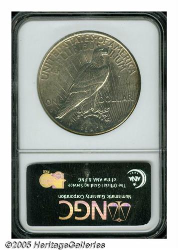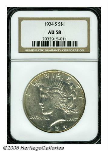 <B>1934-S<S$1> AU58 NGC.</B></I> The key to the Peace dollar series in any condition approaching Mint State. Sure to be sought by the budget conscious collector. Almost fully lustrous and well struck, with slivers of golden-brown near the borders, traces of wear on Liberty's hair, and a number of small but noticeable abrasions, especially on the obverse.<BR><I>From The Empire State Collection.</B></I>