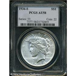 1934-S S$1 AU58 PCGS. A hint of friction is on Lib <B>1934-S S$1 AU58 PCGS.</B></I> A hint of friction is on Liberty's cheekbone and the eagle's shoulder, but the cartwheel luster is pervasive and the only mark of relevance is a tick on the tip of the nose. A worthy substitute for a fully Uncirculated example. <BR><BR><B>Important notice:</B> Heritage usually auctions material at the rate of 200-250 lots per hour. On some occasions eBay Live bid software or the Internet may not be able to keep up with the pace of the auction. We recommend placing a realistic absentee bid now as insurance to avoid disappointment. Occasionally the auctioneer may eliminate or reject an eBay Live bid, and the auctioneer may also reopen a lot after the close of the eBay live bidding (usually because we missed an audience bid), and may reject your bid even if it shows you as the winning bidder. By bidding via eBay Live, you agree that Heritage may award the lot to another bidder at its sole discretion under the circumstances described above or any other reasonable circumstances. Since eBay bids are not shown to us until we open the lot on the floor, we treat those bids just like floor bids. In most cases the floor responds before the eBay bid is presented to us, due to Internet lag time, so for consistency we have made it a policy that floor bids are always considered first over tie eBay live bids. Also please note that all Heritage lots purchased through eBay Live carry a 20% Buyer's Premium. Please make sure you read the Terms and Conditions before you bid. This lot is being auctioned in conjunction with a live floor auction by Heritage Galleries & Auctioneers. All final auction and invoice information will be supplied by Heritage Galleries & Auctioneers, and all other information should be considered preliminary. Lot:7824