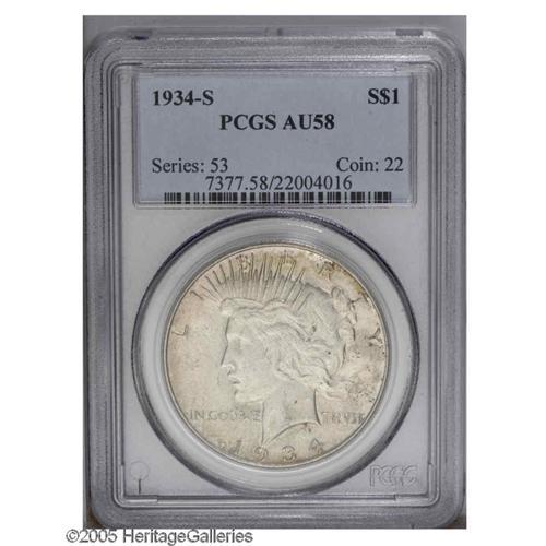 1934-S S$1 AU58 PCGS. Save for some light rub on the e 1934-S[S$1] AU58 PCGS.