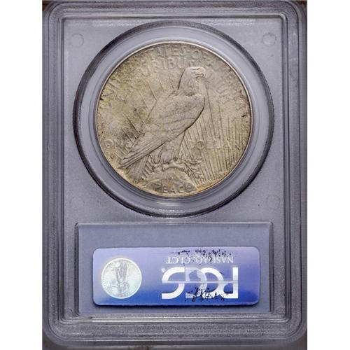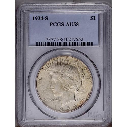 <B>1934-S<img border='0' src='http://www.heritagecoins.com/images/star.gif' width=10 height=10>$1> AU58 PCGS.</B></I> This key date dollar appears Mint State at first glance, since the cartwheel luster is unbroken across both sides. A mere whisper of friction on the hair and wing highpoints keeps this lovely olive-gray and tan-gold piece from a higher grade.