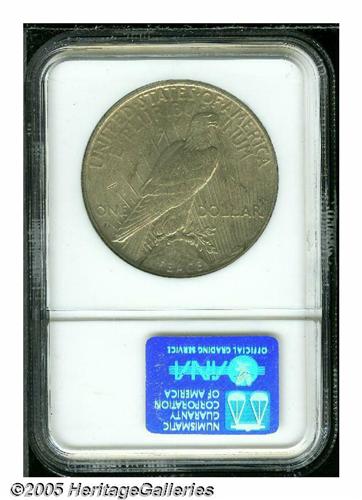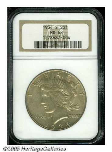 <B>1934-S<S$1> MS62 NGC.</B></I> Just over a million pieces were struck of the 1934-S, and it has long been recognized as a key date in this challenging, short-lived series. This coin is typically struck, with matte-like surfaces and somewhat murky golden-gray coloration. There are a few noticeable blemishes on the reverse.