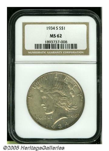 <B>1934-S<S$1> MS62 NGC.</B></I> This key date '34-S displays golden-brown patina, with a couple of splashes of faded red here and there. The design features are sharply impressed, and a few minor contact marks are noted on Liberty's neck, and a moderate milling mark is unfortunately located over Liberty's eye.<BR><I>From the Dr. Kurt Peters Collection.</B></I> From the Dr. Kurt Peters Collection.