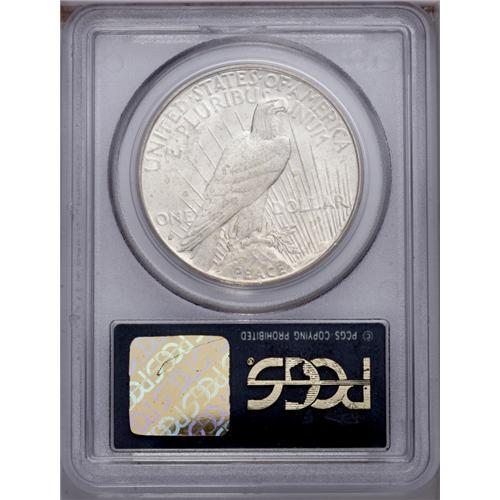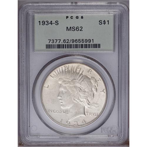 <B>1934-S<img border='0' src='http://www.heritagecoins.com/images/star.gif' width=10 height=10>$1> MS62 PCGS.</B></I> Delicate tan toning visits this lustrous older holder key date Peace dollar. The strike is slightly incomplete in the centers, but the borders are sharp, and marks are few in number.