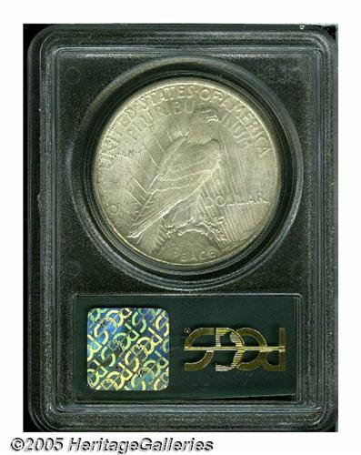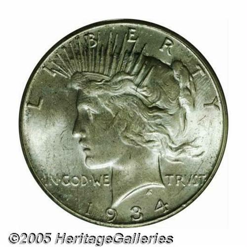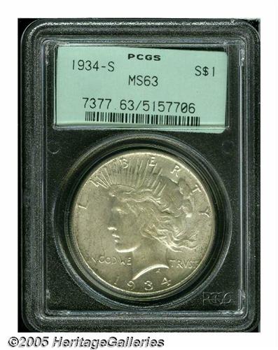 <B>1934-S<S$1> MS63 PCGS.</B></I> Exuberant mint luster is this coin's strong suit. There is little toning on either side to distract the viewer's attention from the original mint sheen that races around each side as it is tilted beneath a light. Sharply struck for the issue, there are no large or singularly mentionable abrasions, just the small marks one would expect from a coin in this grade.