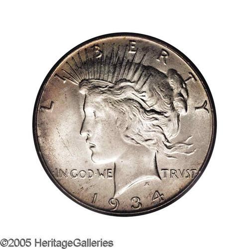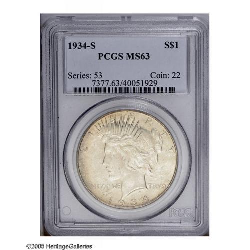 <B>1934-S<S$1> MS63 PCGS.</B></I> A light patina of copper-gold covers both sides. Pleasingly detailed for the grade, but examination with a glass reveals a deep scrape through the hair and a few light scrapes on the cheek. A few other marks are grade-consistent, but this example retains considerable charm.<BR><I>From The Andy Geosits Collection.</B></I>