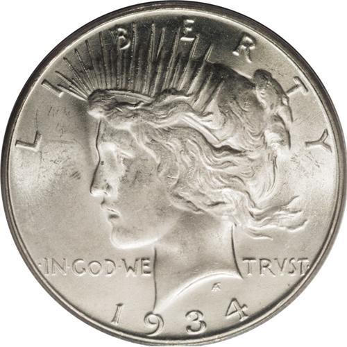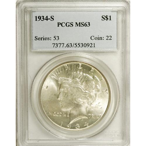 <B>1934-S S$1 MS63 PCGS.</B></I> Select with above-average detail and smooth, creamy luster. Subtle dappled champagne and pastel-blue patina graces the surfaces. A handful of minor abrasions appear on the obverse, though that side appears clean overall; the grade-defining mark appears on the reverse, where it crosses the eagle's lower tailfeathers.<BR><BR><b>Shipping:</b> Coin/Currency (<a target="_blank" href="http://www.heritageauctions.com/common/shipping.php">view shipping information</a>)