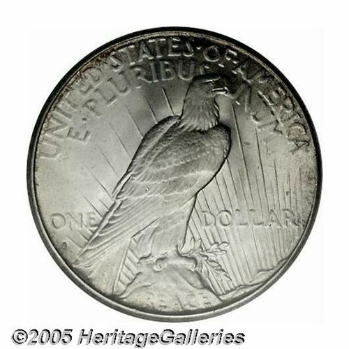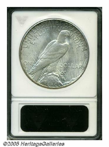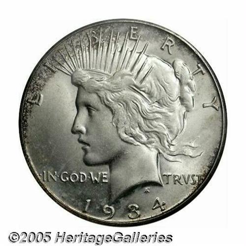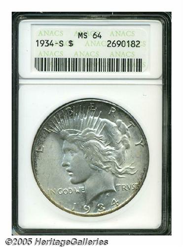<B>1934-S<S$1> MS64 ANACS.</B></I> A well struck and frosty representative with a hint of russet-brown color near the margins. The obverse field is especially clean, although a couple of minor luster grazes on the portrait preclude status as a full Gem. Although the 1934-S is not the key date Peace Dollar in average circulated grades, its scarcity is apparent relative to the lower mintage 1928 in AU and finer condition.