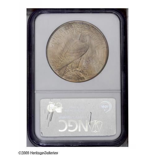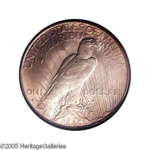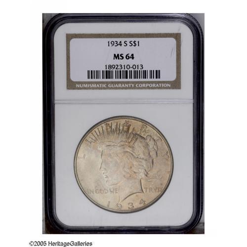 <B>1934-S<S$1> MS64 NGC.</B></I> Gorgeous original toning graces this popular key-date Peace dollar, with a light transparent wash of golden-copper accented by blue-gray on both sides. Subdued luster radiates from beneath the satiny fields, and examination with a loupe reveals few ticks that are well hidden in the hair that perhaps limit a higher grade.