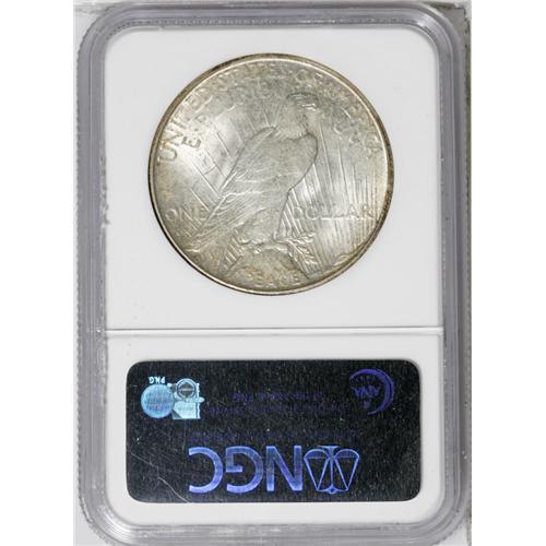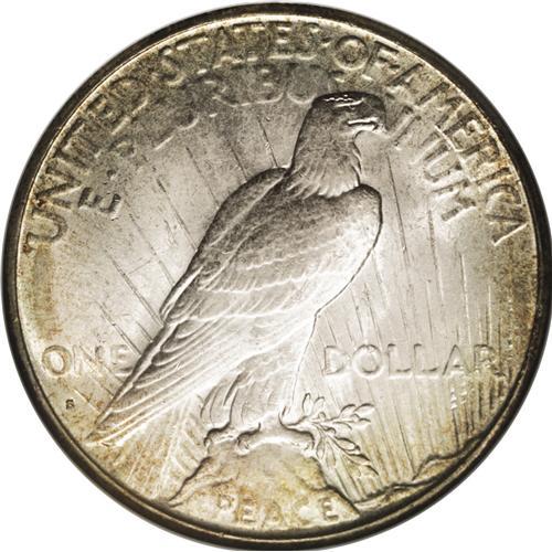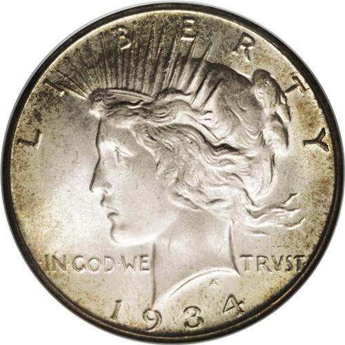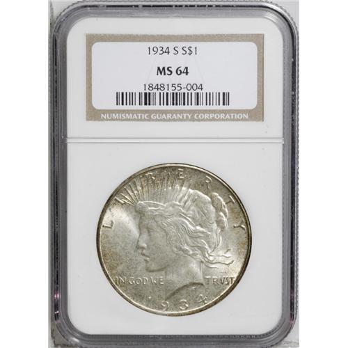 <B>1934-S<img border='0' src='http://www.heritagecoins.com/images/star.gif' width=10 height=10>$1> MS64 NGC.</B></I> This is a lustrous and attractive near-Gem quality example with ivory surfaces and peripheral gold accents on each side. The 1934-S dollar has always been considered one of two key-date issues, based on a low mintage of just over 1 million coins. Mint State examples are usually available at the lowest levels, but Choice and Gem quality pieces are scarcely seen.