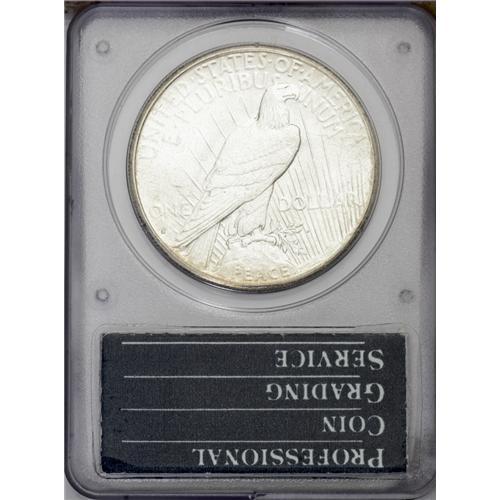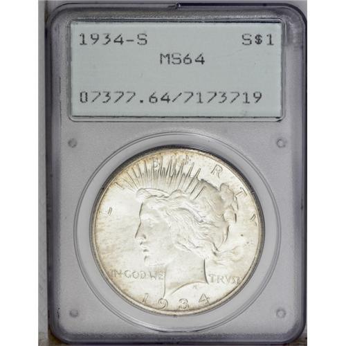 <B>1934-S<img border='0' src='http://www.heritagecoins.com/images/star.gif' width=10 height=10>$1> MS64 PCGS.</B></I> Well defined, as is more typical of this condition rarity than earlier S-mints in the series, with delicate blushes of golden patina here and there. Only a few out-of-the-way marks in the right obverse field and well concealed within the eagle's wing feathers preclude an advancement in grade. Housed in an old PCGS "rattler" and a solidly graded example of this difficult late-date Peace dollar. <BR><BR><B>Important notice:</B> Heritage usually auctions material at the rate of 200-250 lots per hour. On some occasions eBay Live bid software or the Internet may not be able to keep up with the pace of the auction. We recommend placing a realistic absentee bid now as insurance to avoid disappointment. Occasionally the auctioneer may eliminate or reject an eBay Live bid, and the auctioneer may also reopen a lot after the close of the eBay live bidding (usually because we missed an audience bid), and may reject your bid even if it shows you as the winning bidder. By bidding via eBay Live, you agree that Heritage may award the lot to another bidder at its sole discretion under the circumstances described above or any other reasonable circumstances. Since eBay bids are not shown to us until we open the lot on the floor, we treat those bids just like floor bids. In most cases the floor responds before the eBay bid is presented to us, due to Internet lag time, so for consistency we have made it a policy that floor bids are always considered first over tie eBay live bids. Also please note that all Heritage lots purchased through eBay Live carry a 20% Buyer's Premium. Please make sure you read the Terms and Conditions before you bid. This lot is being auctioned in conjunction with a live floor auction by Heritage Galleries & Auctioneers. All final auction and invoice information will be supplied by Heritage Galleries & Auctioneers, and all other information should be considered preliminary. Lot:3875 <BR><BR><B>Winning Notification and Billing:</B> After the FINAL session in this auction is complete, Heritage will send e-mail and snail mail invoices. This process normally takes several days. All final auction and invoice information will be supplied by Heritage Galleries & Auctioneers, and all other information should be considered preliminary. <BR><BR>This auction will be conducted on a live auction floor and over the Internet through eBay Live. If you choose to place an absentee bid, please take a moment to <font color='#0000ff'><u><a href='http://pages.ebay.com/liveauctions/help/before/laabsentee.html'>learn how eBay Live absentee bidding works</a></u></font><font color='#000000'>