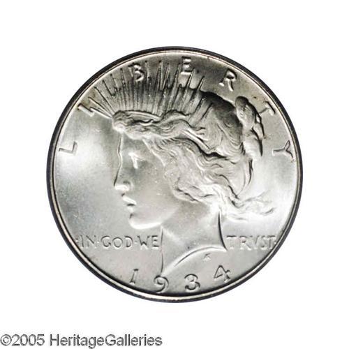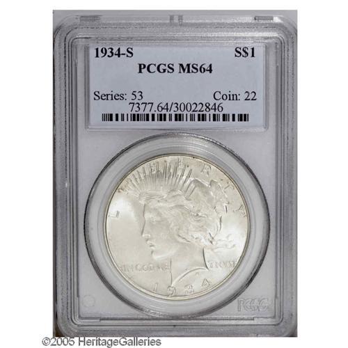 <B>1934-S<S$1> MS64 PCGS.</B></I> While other issues have eclipsed the 1934-S in Gem and better grades because of strike rarity, the '34-S is still considered the key to the Peace Dollar and for good reasons. Only 1.01 million pieces were struck and high grade examples are very scarce. This is a splendid, highly lustrous example that is brilliant throughout and shows only the slightest luster grazes on Liberty's cheek. Sharply defined overall.