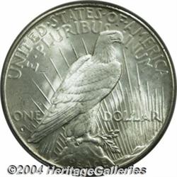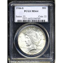 <B>1934-S<S$1> MS64 PCGS.</B></I> A well struck and frosty representative with a hint of golden-brown color near the margins. The obverse field is especially clean, although a couple of minor luster grazes on the portrait preclude status as a full Gem. Although the 1934-S is not the key date Peace Dollar in average circulated grades, its scarcity is apparent relative to the lower mintage 1928 in AU and finer condition. <BR><BR><B>Important notice:</B> Heritage usually auctions material at the rate of 200-250 lots per hour. On some occasions eBay Live bid software or the Internet may not be able to keep up with the pace of the auction. We recommend placing a realistic absentee bid now as insurance to avoid disappointment. Occasionally the auctioneer may eliminate or reject an eBay Live bid, and the auctioneer may also reopen a lot after the close of the eBay live bidding (usually because we missed an audience bid), and may reject your bid even if it shows you as the winning bidder. By bidding via eBay Live, you agree that Heritage may award the lot to another bidder at its sole discretion under the circumstances described above or any other reasonable circumstances. Since eBay bids are not shown to us until we open the lot on the floor, we treat those bids just like floor bids. In most cases the floor responds before the eBay bid is presented to us, due to Internet lag time, so for consistency we have made it a policy that floor bids are always considered first over tie eBay live bids. Also please note that all Heritage lots purchased through eBay Live carry a 20% Buyer's Premium. Please make sure you read the Terms and Conditions before you bid. </span></font></tr></table></td></tr></table>