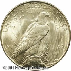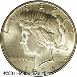 1934-S S$1 MS65 PCGS. While other issues have ecli <B>1934-S S$1 MS65 PCGS.</B></I> While other issues have eclipsed the 1934-S in Gem and better grades because of strike rarity, the '34-S is still considered the key to the Peace Dollar and for good reasons. Only 1.01 million pieces were struck and high grade examples are very scarce. This is a splendid, highly lustrous example that is brilliant throughout and shows only the slightest luster grazes. Sharply defined overall. Population: 135 in 65, 18 finer (11/04). <BR><BR><B>Important notice:</B> Heritage usually auctions material at the rate of 200-250 lots per hour. On some occasions eBay Live bid software or the Internet may not be able to keep up with the pace of the auction. We recommend placing a realistic absentee bid now as insurance to avoid disappointment. Occasionally the auctioneer may eliminate or reject an eBay Live bid, and the auctioneer may also reopen a lot after the close of the eBay live bidding (usually because we missed an audience bid), and may reject your bid even if it shows you as the winning bidder. By bidding via eBay Live, you agree that Heritage may award the lot to another bidder at its sole discretion under the circumstances described above or any other reasonable circumstances. Since eBay bids are not shown to us until we open the lot on the floor, we treat those bids just like floor bids. In most cases the floor responds before the eBay bid is presented to us, due to Internet lag time, so for consistency we have made it a policy that floor bids are always considered first over tie eBay live bids. Also please note that all Heritage lots purchased through eBay Live carry a 20% Buyer's Premium. Please make sure you read the Terms and Conditions before you bid. This lot is being auctioned in conjunction with a live floor auction by Heritage Galleries & Auctioneers. All final auction and invoice information will be supplied by Heritage Galleries & Auctioneers, and all other information should be considered preliminary. Lot:7828