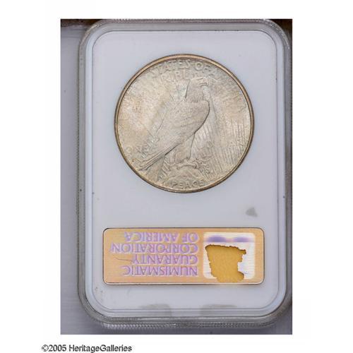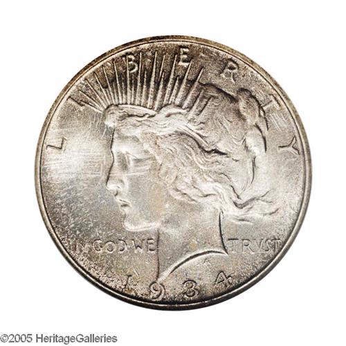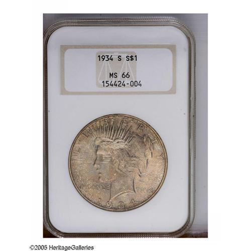 <B>1934-S<S$1> MS66 NGC.</B></I> In all our years of offering the finest collector coins in the world, we have only handled a handful MS66 1934-S Peace Dollars graded by the two major grading services. This is the undisputed key to the series, and although there are rarer Peace Dollars in this lofty grade, none has the allure of this widely-regarded issue. This specimen is beautifully toned in delicate autumn brown and steel-blue pastels mostly over the obverse. The underlying luster is superb and the surfaces are exceptionally clean. In short, this condition rarity is a real show-stopper and one which is sure to excite the fancy of any advanced Peace Dollar collector. A lovely coin for the best set, as none have been graded higher by either PCGS or NGC. Population: 12 in 66, 0 finer (10/05).<BR><I>From The Albert E. Willis Collection.</B></I>