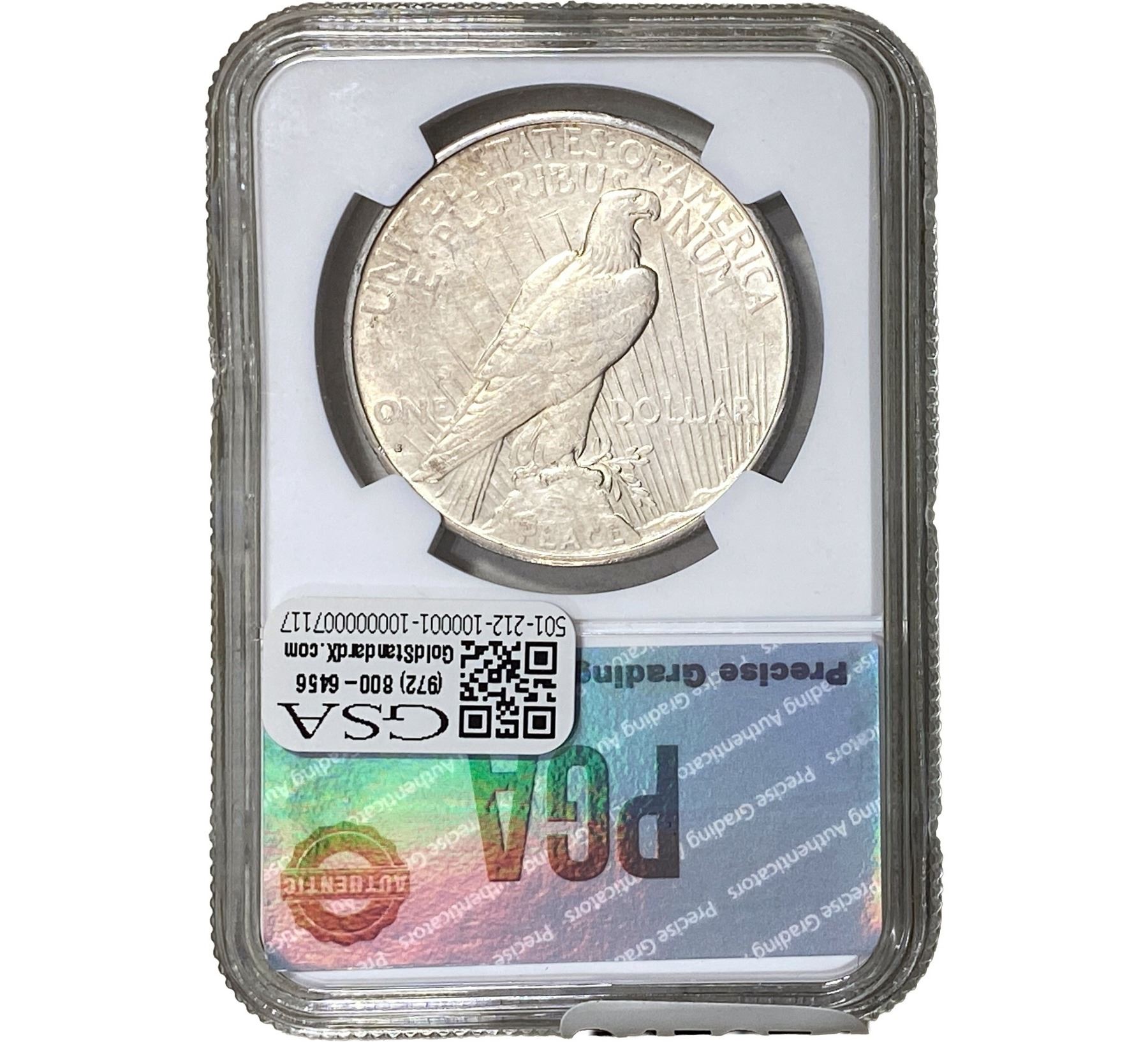 e. Coins sold referencing a third-party grading service are sold “AS IS” without any express or implied warranty, except for a guarantee by GSA that they are genuine. Removal or alteration of the holder, voids all of Bidder’s claims concerning that Product. Certain warranties may be available from the grading services and Bidders are referred to them for further details: Numismatic Guaranty Corporation (NGC), PO Box 4776, Sarasota, FL 34230, www.ngccoin.com/services/writtenguarantee.asp; Professional Coin Grading Services (PCGS), PO Box 9458, Newport Beach, CA 92658, www.pcgs.com/guarantee.html; ANACS, 6555 S. Kenton St., Ste. 303, Englewood, CO 80111; and Independent Coin Grading Co. (ICG), 7901 East Bellview, Ave., Suite 50, Englewood, CO 80111.