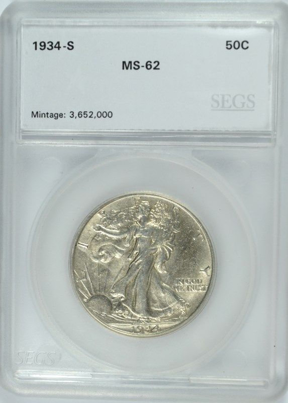 1934-S WALKING LIBERTY HALF DOLLAR, SEGS MS-62