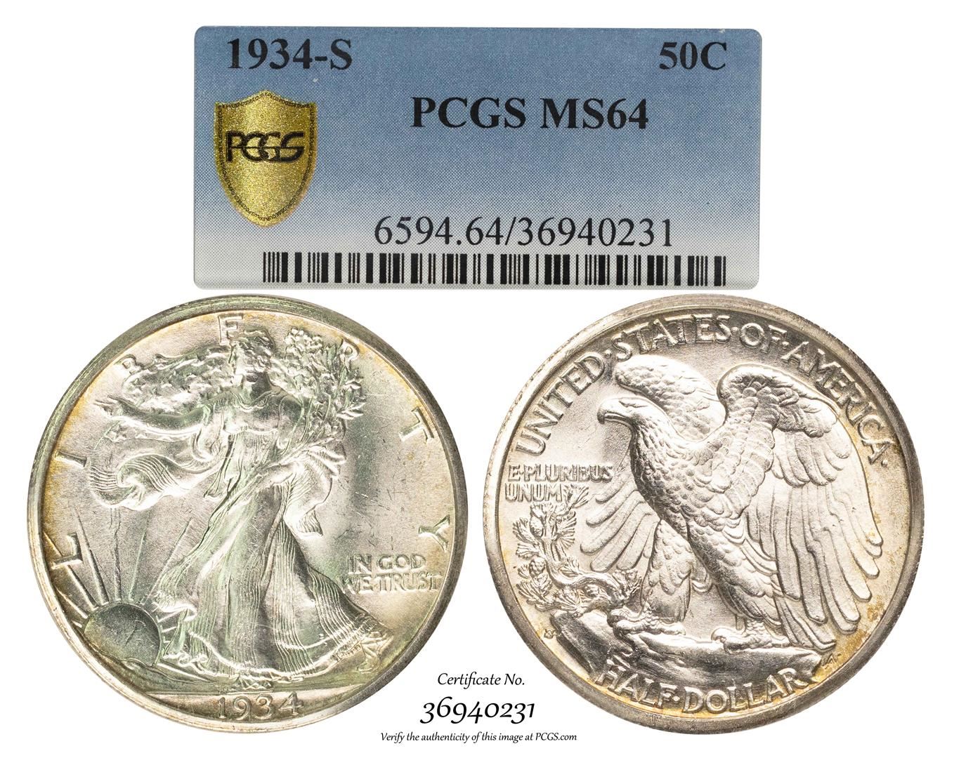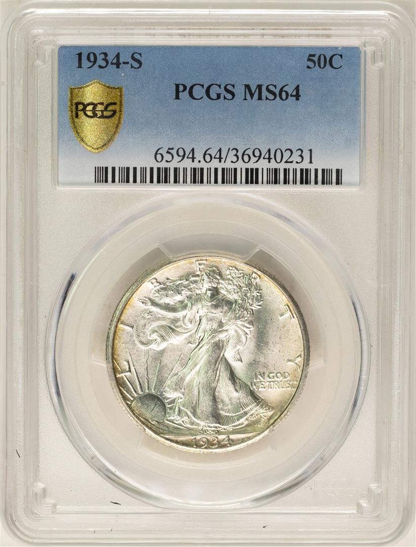 One 1934-S Walking Liberty Half Dollar Coin PCGS MS64. PCGS Graded.